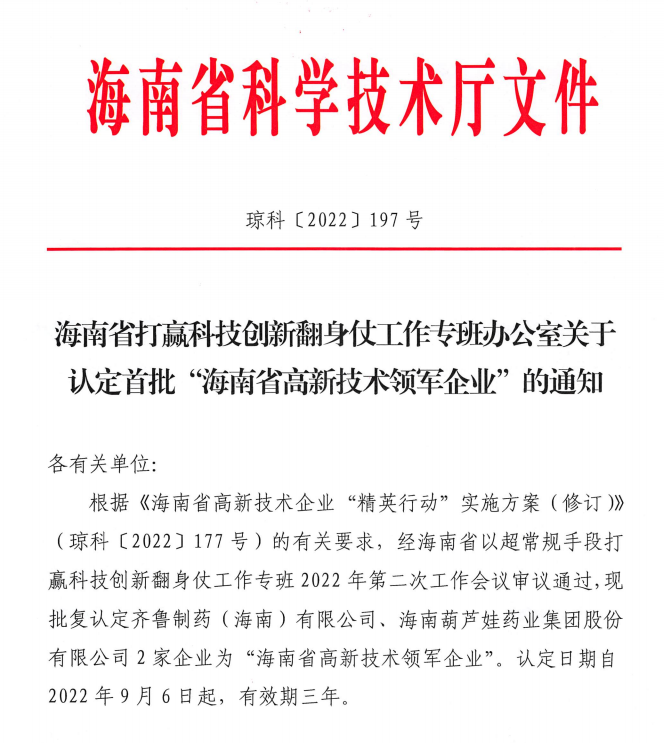 近日,海南省科学技术厅发布的《海南省打赢科技创新翻身仗工作专班办公室关于认定首批“海南省高新技术领军企业”的通知》中显示,批复认定海南尊龙·Z6药业集团股份有限公司等2家企业为“海南省高新技术领军企业”。认定日期自2022年9月6日起,有效期三年。