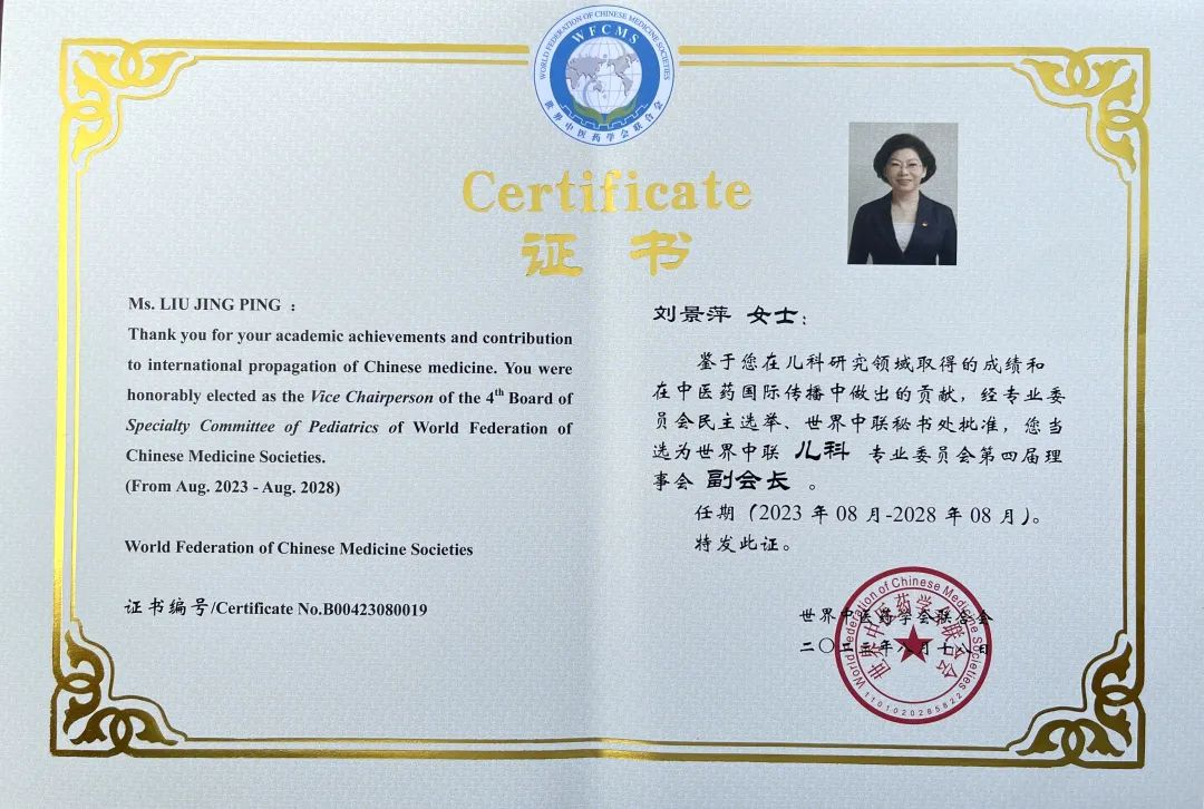尊龙·Z6药业集团党委书记、董事长刘景萍当选世界中医药学会联合会儿科专业委员会第四届理事会副会长